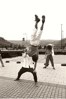 Bruno SPIELMANN Création d'un trio-portés avec Vincent Millet pour IDEKLIC (39) avec la Cie du Courant d'Air, comédien acrobate dans "Meunier tu rêves avec Vincent Millet et Annie Dubet.
